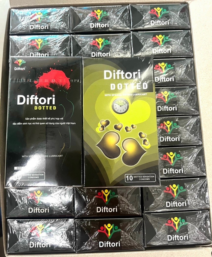 Bao cao su Diftori Dotted đươc sản xuất từ cao su tự nhiên, chất lượng cao trên dây chuyền hiện đại, đồng thời sử dụng dầu silicon an toàn, hạn chế tối đa hiện tượng gây dị ứng. Màu sắc bao cao su trong suốt, trên thân bao có các hạt nổi tạo cảm giác hưng phấn khi sử dụng, nhưng vẫn đảm bảo an toàn..